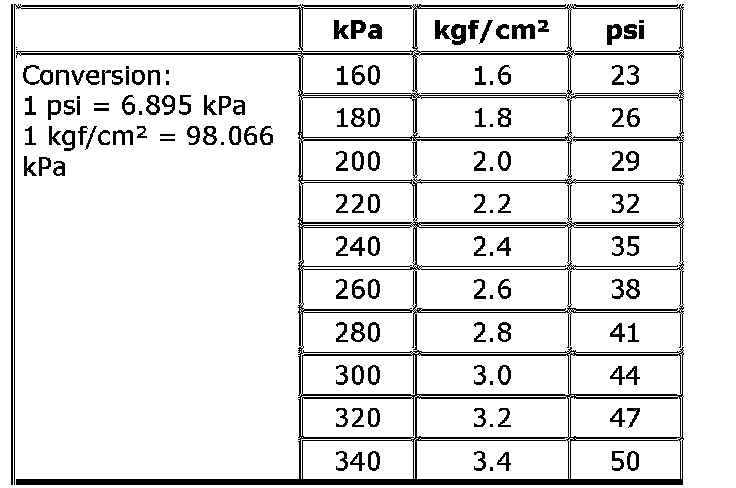 The tire inflation pressure is indicated in kilo-pascal (kPa) while it is also indicated in kgf/cm2 and psi on the Tire Placard. Metric tire gauges are available from tool suppliers. The table below shows unit conversion for commonly used inflation pressures.