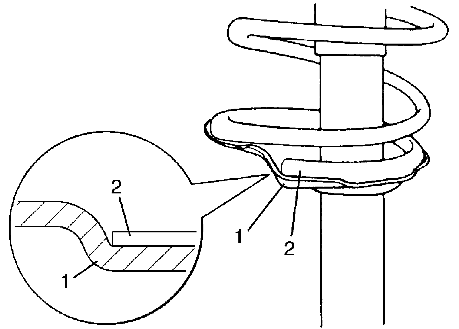 2) Install compressed coil spring to strut assembly while fitting coil spring end (2) in spring lower seat (1) as shown.