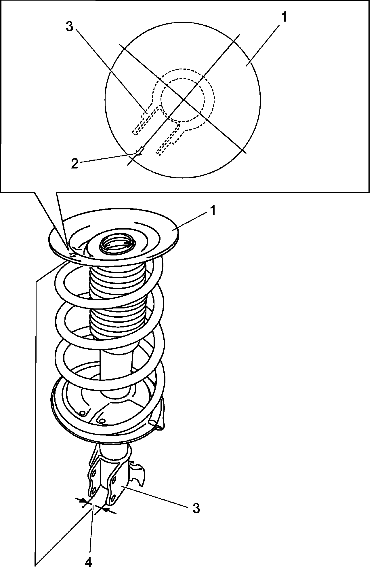 5) Align mark (2) on spring upper sheet (1) with center (4) of steering knuckle bracket (3) and remove special tool from coil spring.