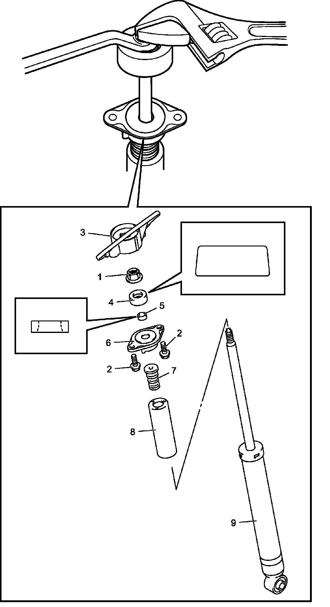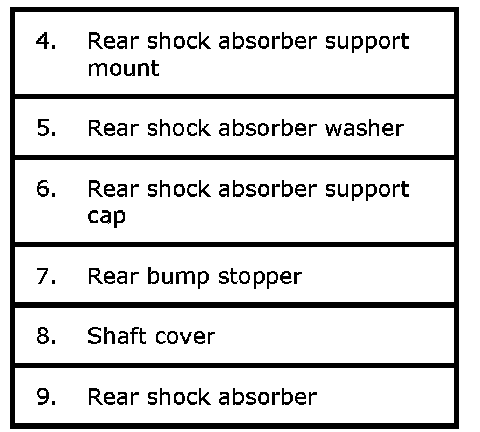 1) Remove rear shock absorber support cap bolt (2) and remove rear shock absorber support (3).