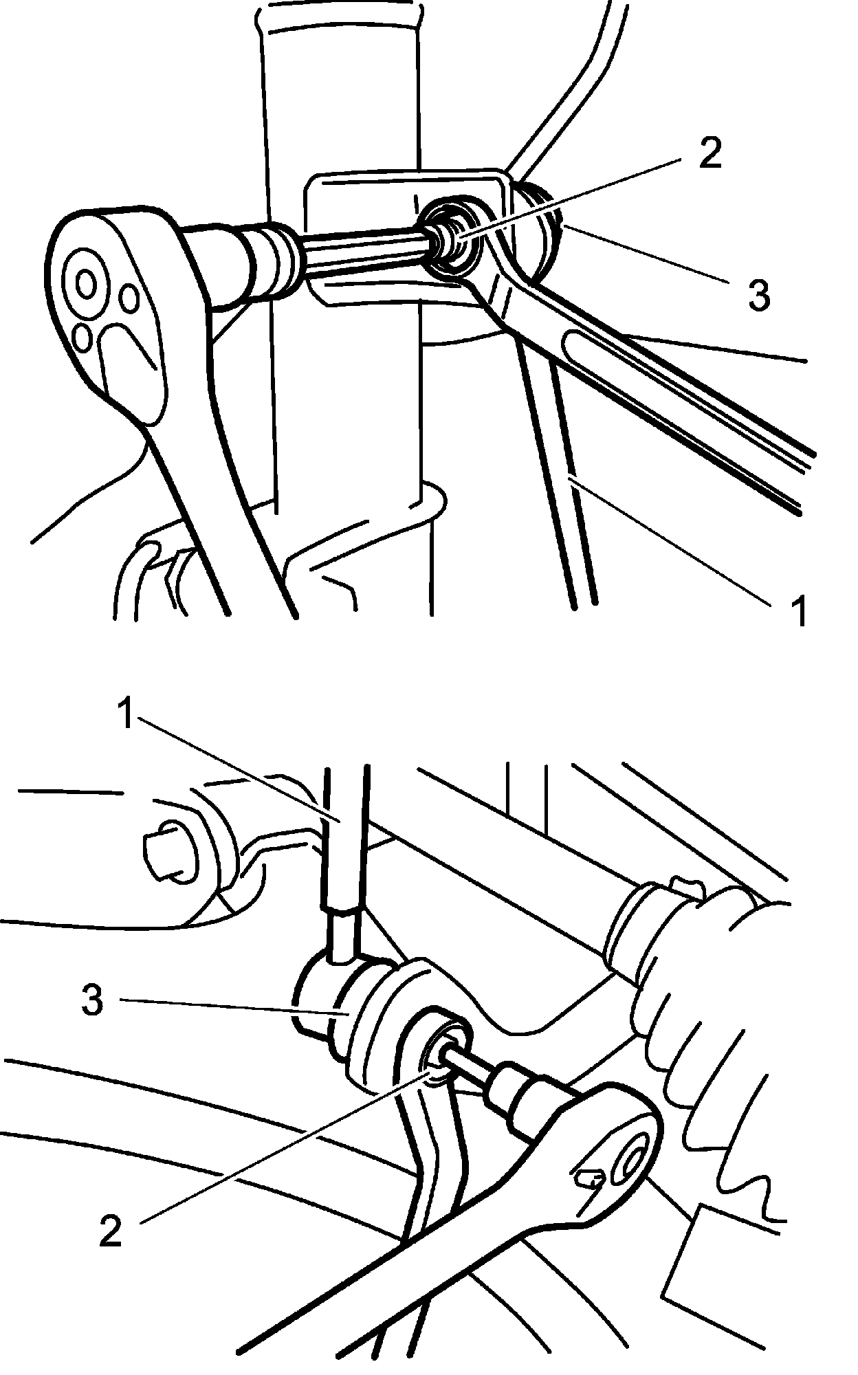 3) While holding ball stud of stabilizer bar joint (1) using hexagon wrench, remove stabilizer bar joint nut (2) and then remove stabilizer bar joint.