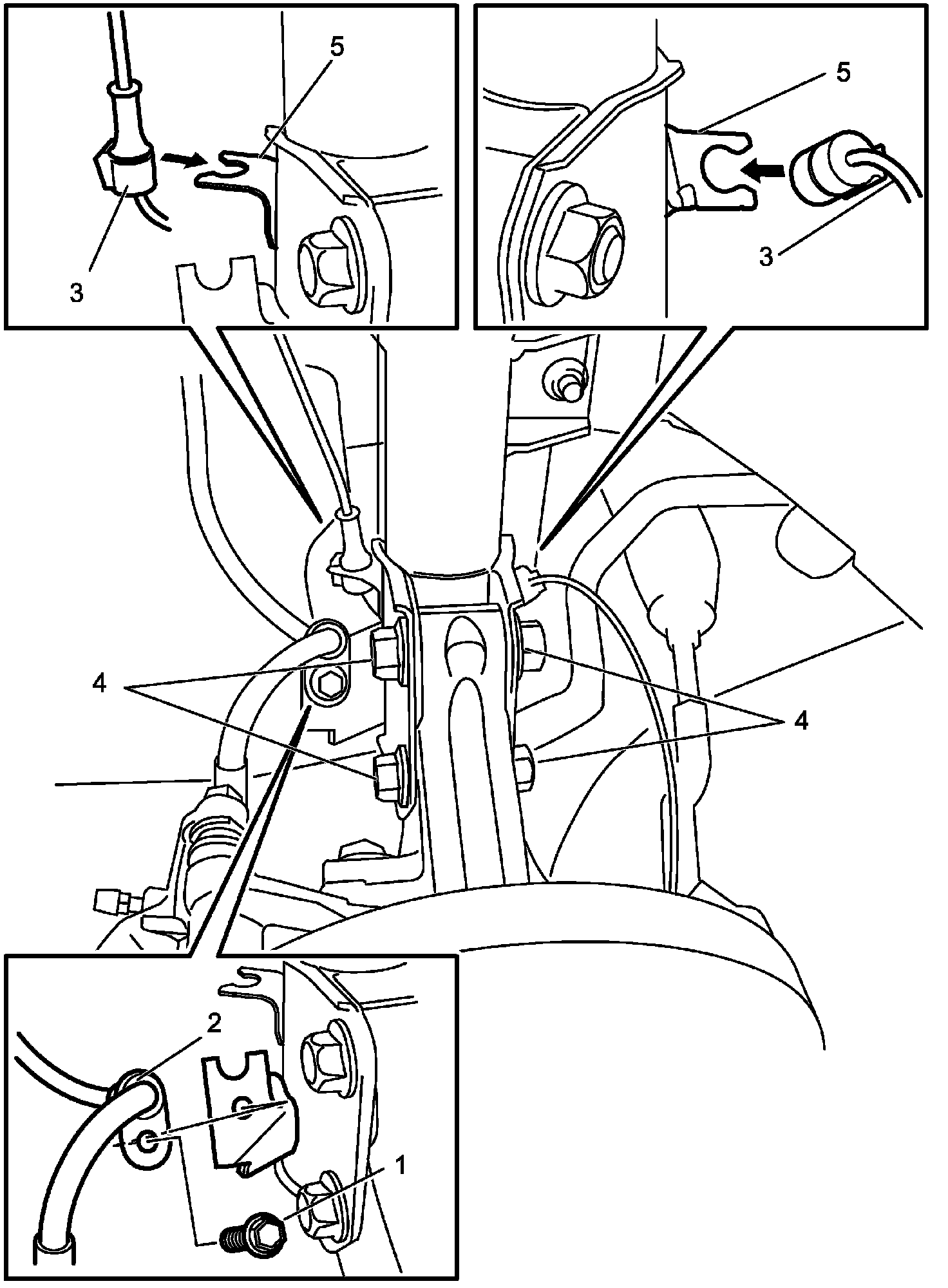 4) Detach the following parts from strut bracket (5): brake hose (2) (by removing brake hose bolt (1)) and wheel speed sensor harness (3).