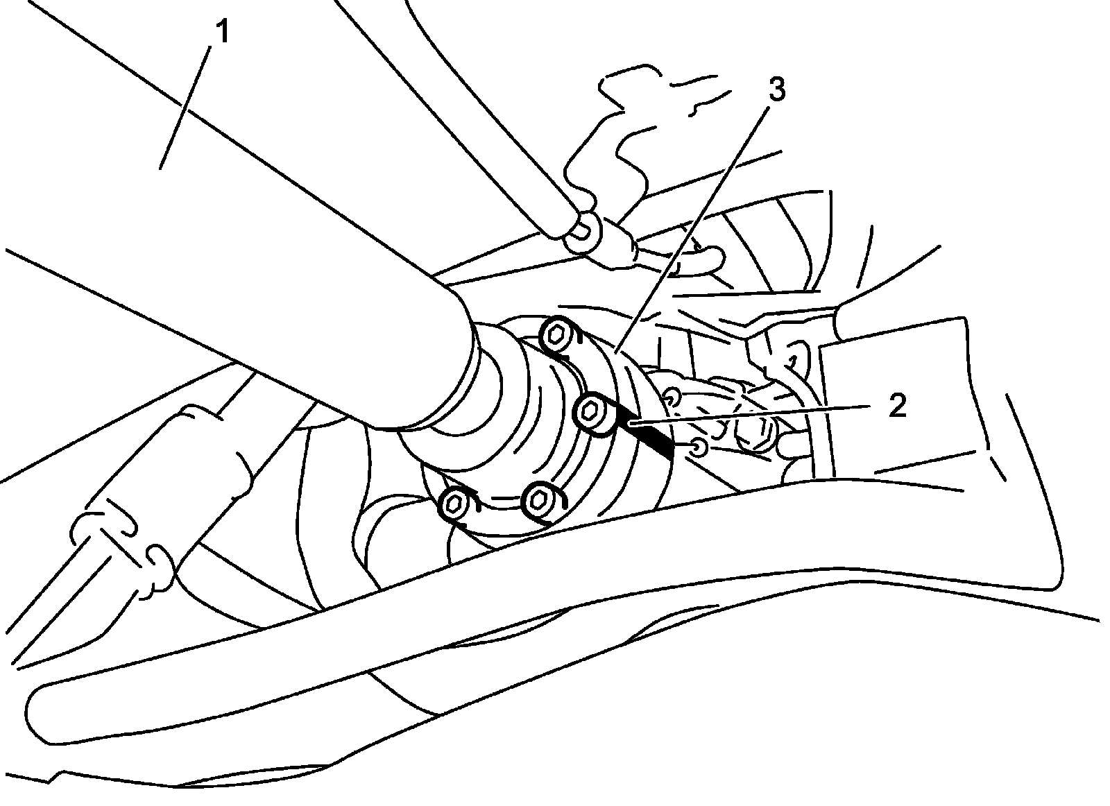 ^ Tighten propeller shaft new front bolts (1) and new rear bolts (2) to specified torque.