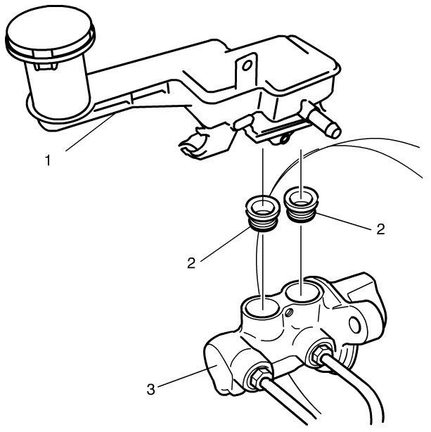1) When using new grommets (2), lubricate them with the same fluid as the one to fill reservoir with.