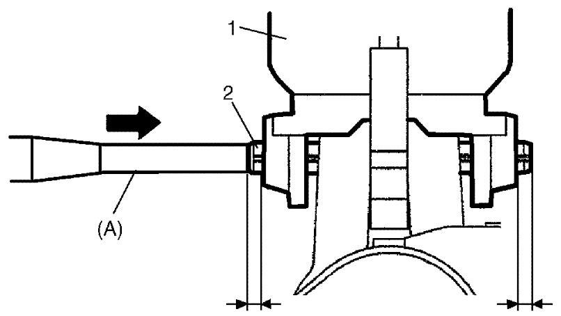 3) Drive in reservoir connector pin (2) by using special tool (A). Till both of its ends at the right and left of reservoir (1) becomes the same length.