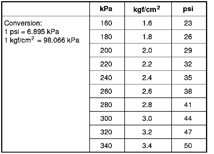 The metric term for tire inflation pressure is the kilo pascal (kPa). Tire pressures will usually be printed in both kPa and psi on the Tire Placard. Metric tire gauges are available from tool suppliers. The chart, below table, converts commonly used inflation pressures from kPa to psi.
