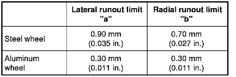 Wheels must be replaced if they are bent, dented, have excessive lateral or radial runout, leak air through welds, have elongated bolt holes, if lug nuts won't stay tight, or if they are heavily rusted. Wheels with greater runout than shown in the figure may cause vibrations.