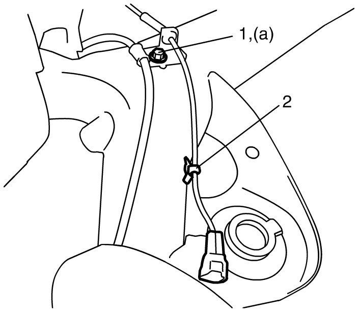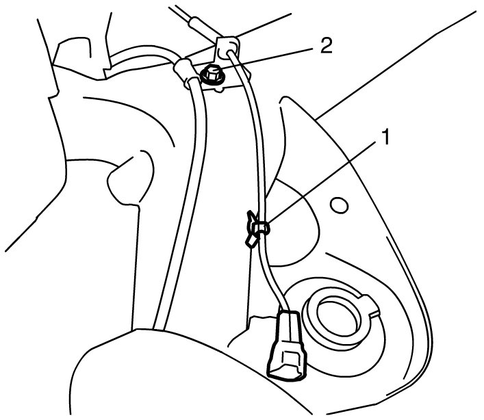 8) Install wheel speed sensor clamps (2) and tighten parking brake cable clamp nuts (1) to specified torque.