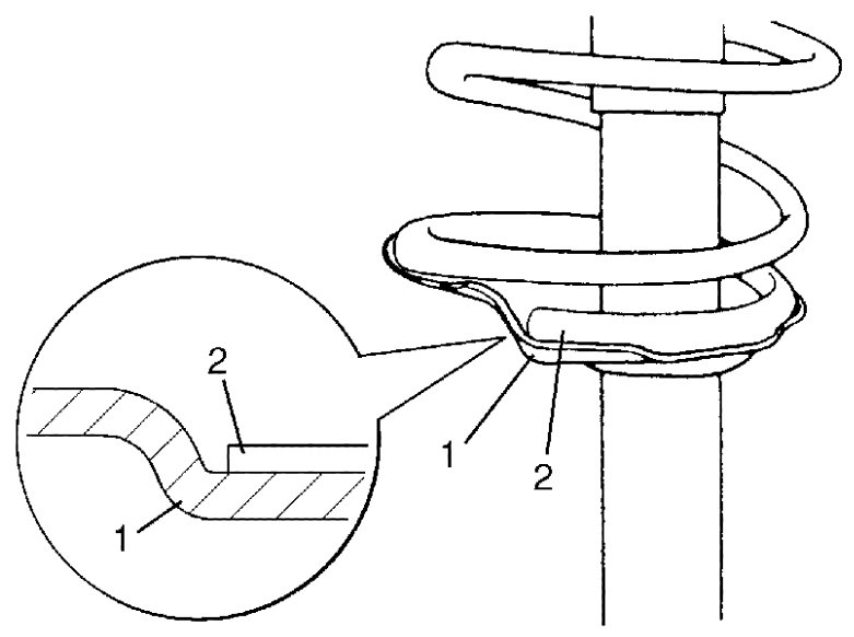 2) Install compressed coil spring to strut, and place coil spring end (2) onto spring lower seat (1) as shown.