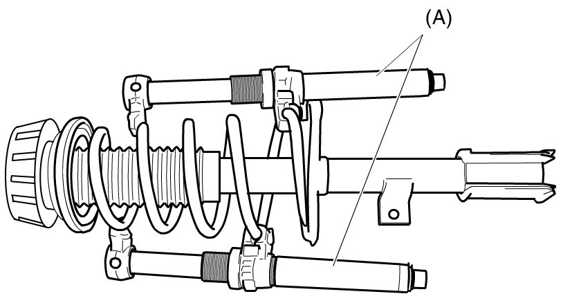 1) Attach special tool (A) to coil spring as shown. Turn special tool bolts alternately until coil spring tension is released. Rotate the strut around its axis to confirm that the coil spring is released or not.