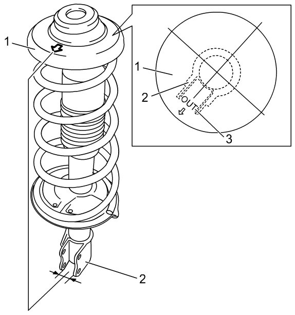5) Install spring seat on coil spring and then spring upper seat (1) aligning "OUT" mark (3) on spring upper seat and center of strut bracket (2).