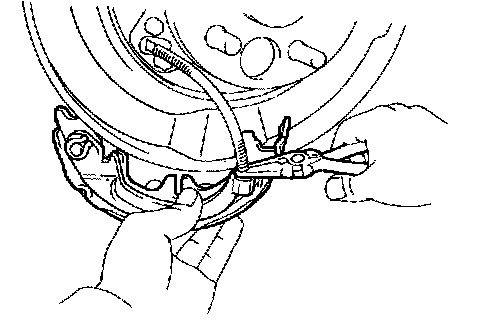 c. Using needle-nose pliers, disconnect the parking brake cable from the parking brake shoe lever.