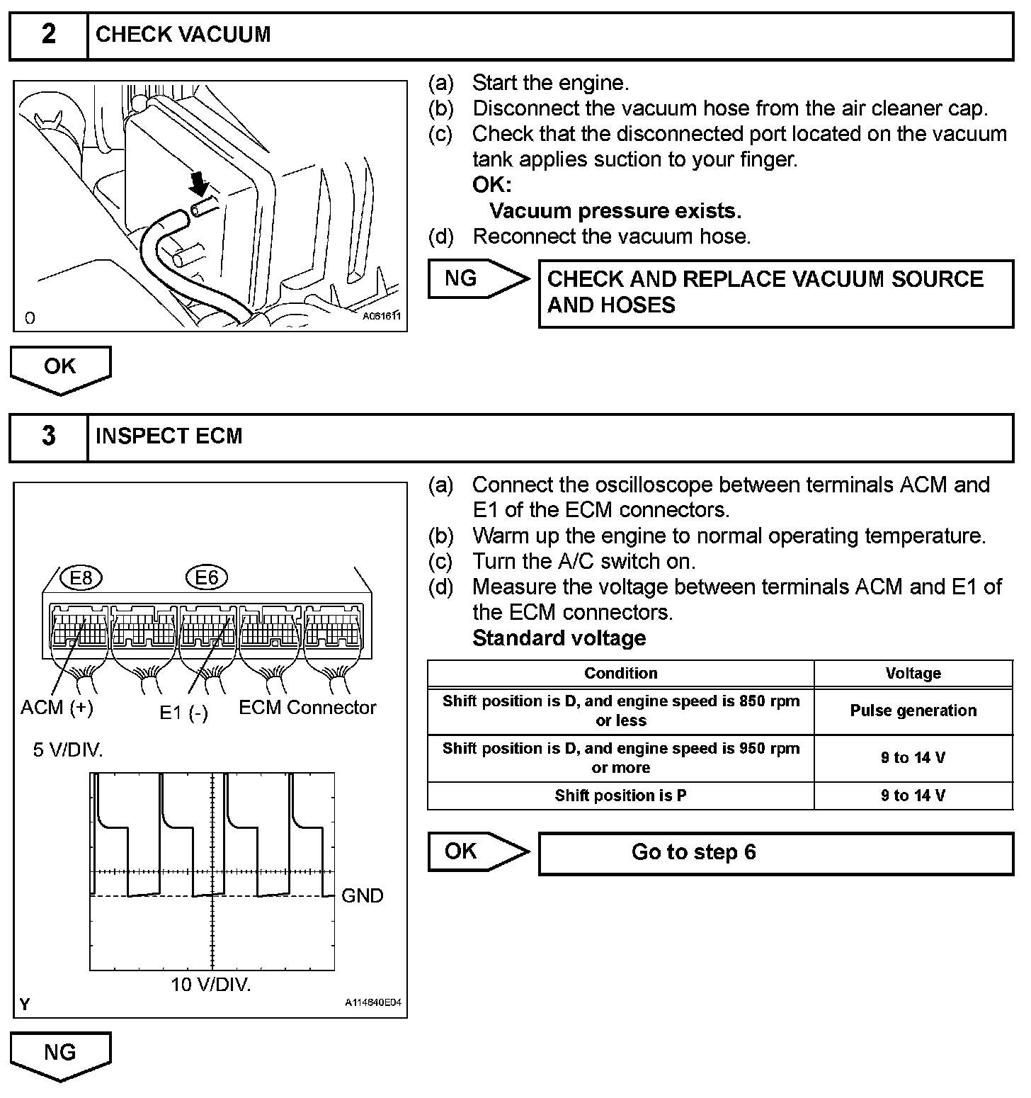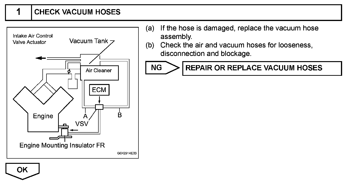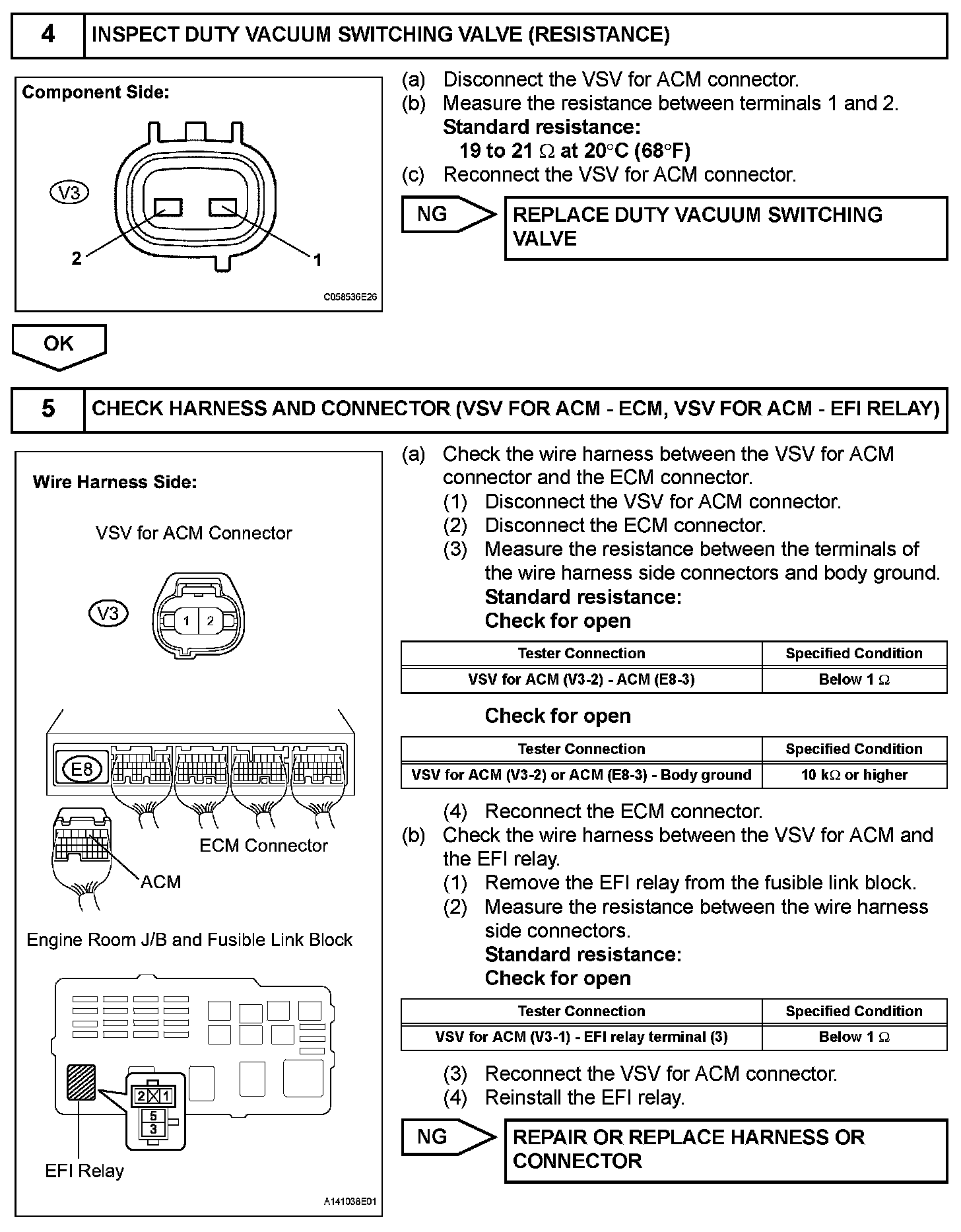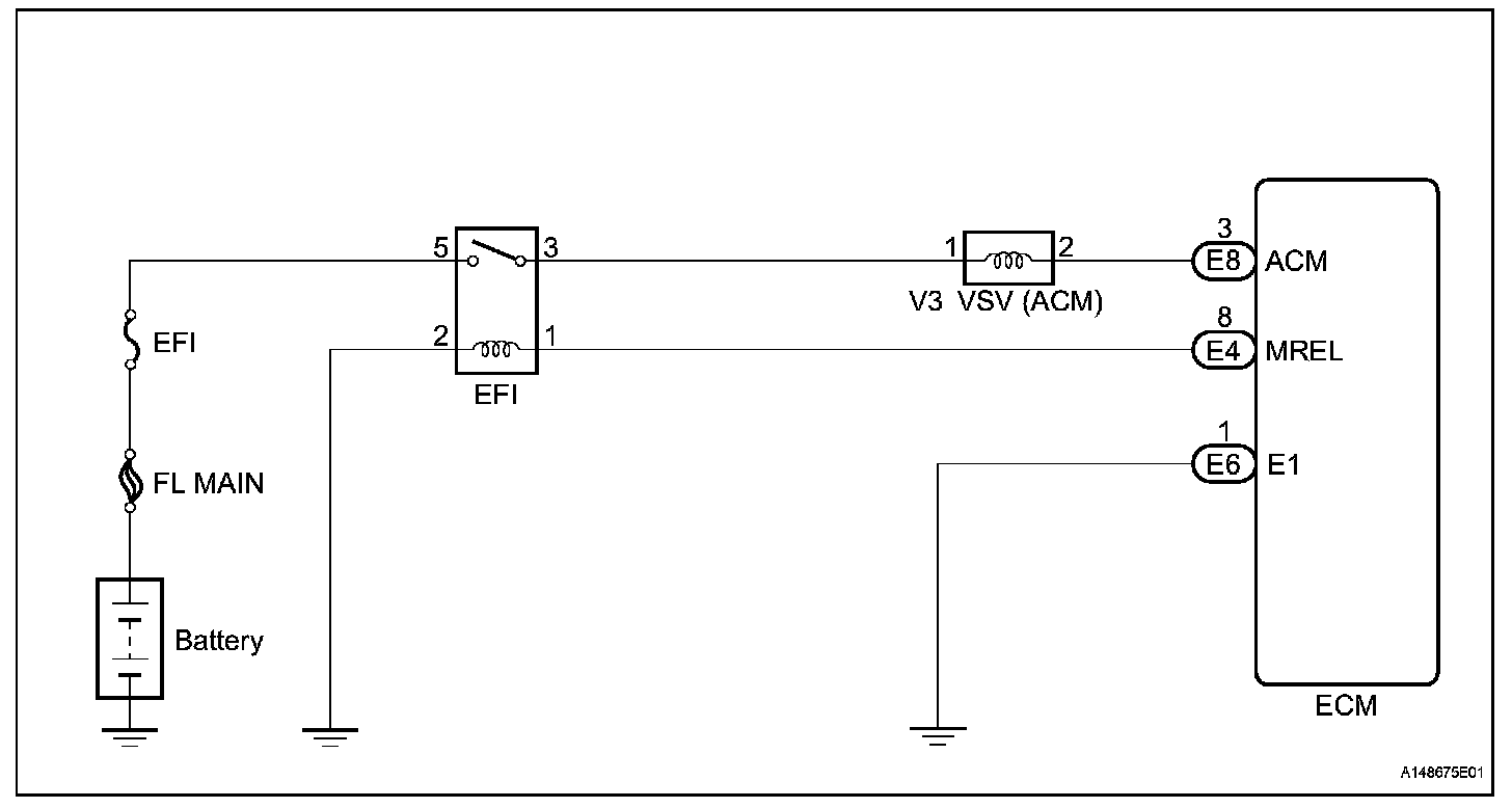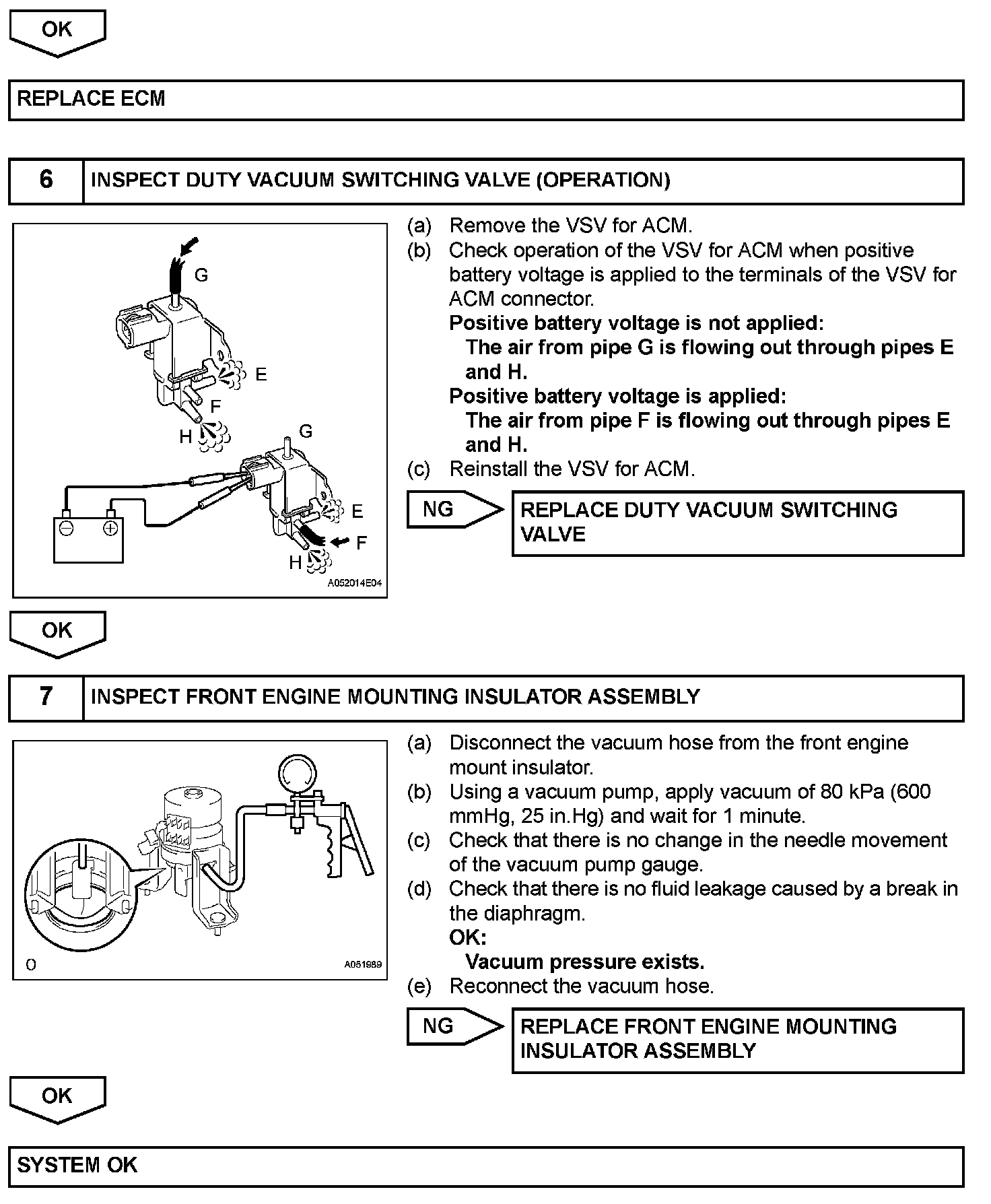The Active Control Engine Mount (ACM) system decreases engine vibration at engine idling using the ACM VSV. The VSV is controlled by a pulse signal transmitted to the VSV from the ECM. The frequency of this pulse signal is matched to the engine speed to decrease engine vibration.