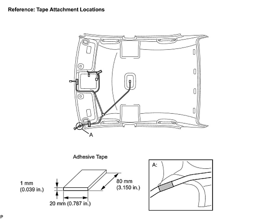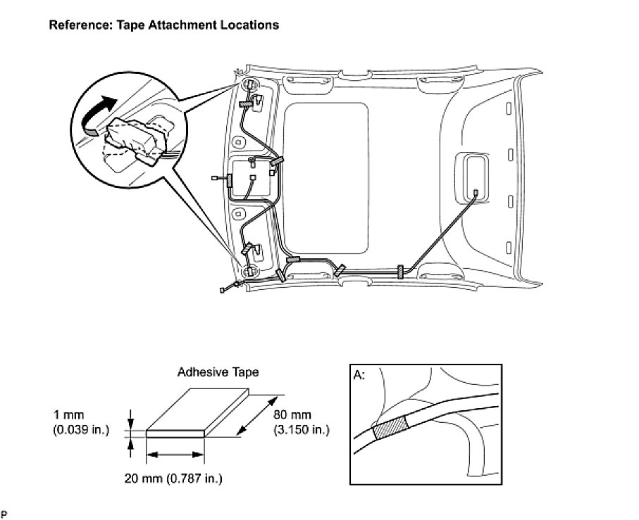 HINT: As shown in illustration A, line up and secure the reference tape of the wire harness to the tip of the roof headlining assembly.