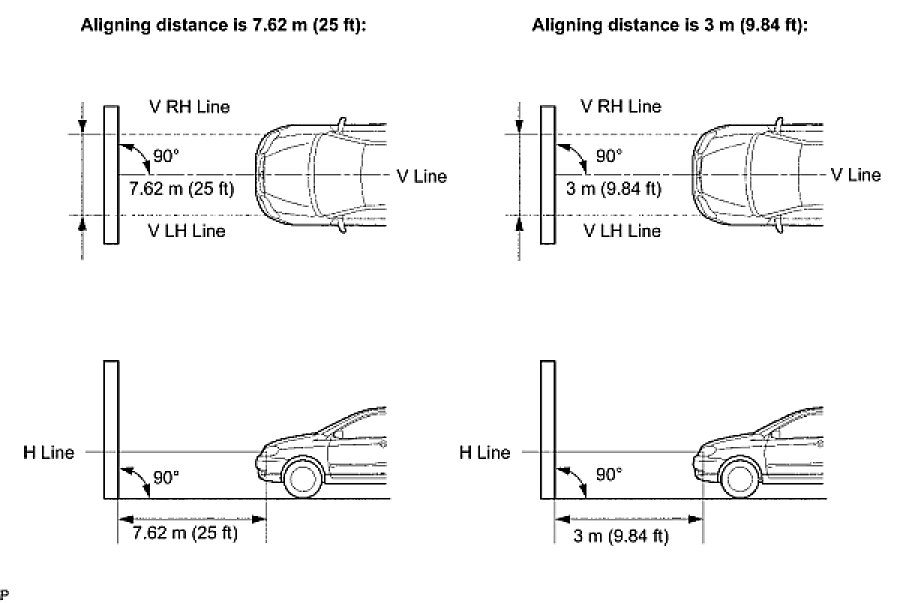 NOTE: A distance of 7.62 m (25 ft) between the vehicle and the wall is necessary for proper aim adjustment. If unavailable, secure a distance of exactly 3 m (9.84 ft) for check and adjustment. (The target zone will change with the distance so follow the instructions in the illustration.)