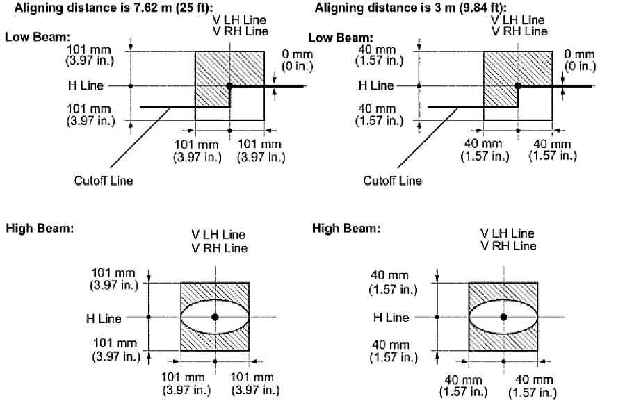 The cutoff line is 101 mm (3.97 in.) above and below the H line as well as left and right of the V line with high-beam (SAEJ599).
