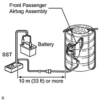 - When deploying the airbag, perform the operation at least 10 m (33 ft) away from the front passenger airbag assembly.