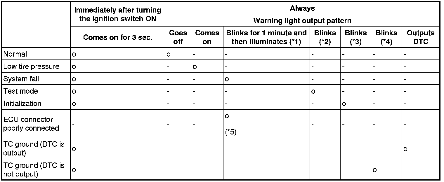 HINT: The table below indicates the state of the tire pressure warning light and indicator after turning the ignition switch to the ON position.