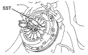 (a) Insert SST in the clutch disc assembly, then insert them in the flywheel sub-assembly.