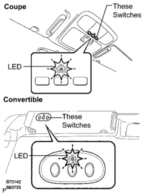 (a) Press the switch and check that each switch turns on the red LED. If one or more of the switches does not turn on the LED, confirm normal operation of the fuse and wire harness, then replace the garage door opener.