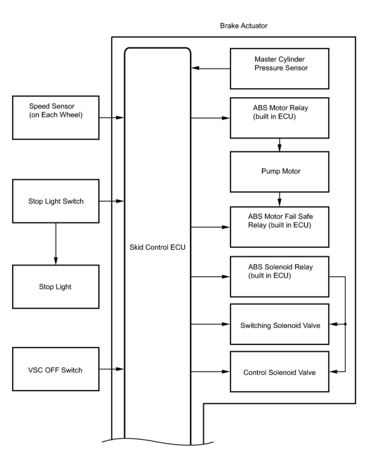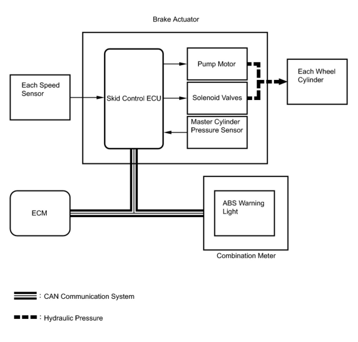 The skid control ECU receives a speed signal from each speed sensor and a fluid pressure signal from the master cylinder pressure sensor to determine whether brake assist is necessary. If brake assist is necessary, the skid control ECU sends control signals to the pump motor and solenoid valves. The pump motor and the solenoid valves then control the pressure applied to each wheel cylinder.