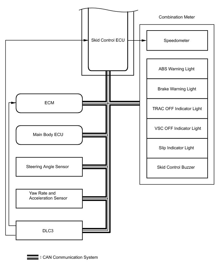 * The yaw rate sensor and acceleration sensor are combined in a single unit. This unit communicates with the skid control ECU through CAN communication.