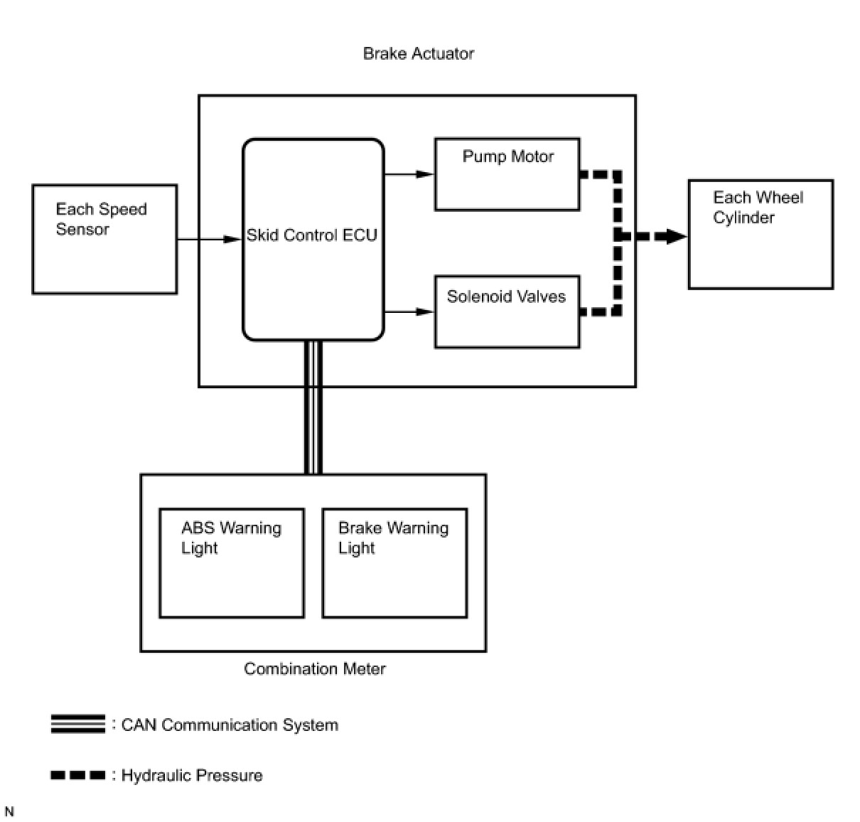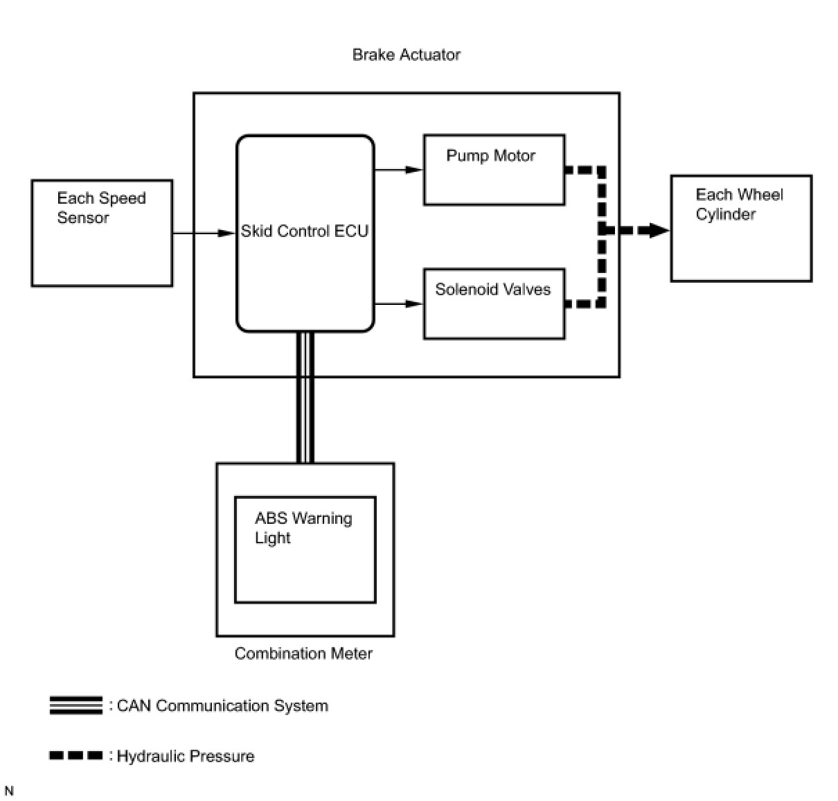 The skid control ECU receives a speed signal from each wheel speed sensor, and uses these signals to detect locking of the wheels. The ECU uses this information in order to determine appropriate control of the solenoid valves.