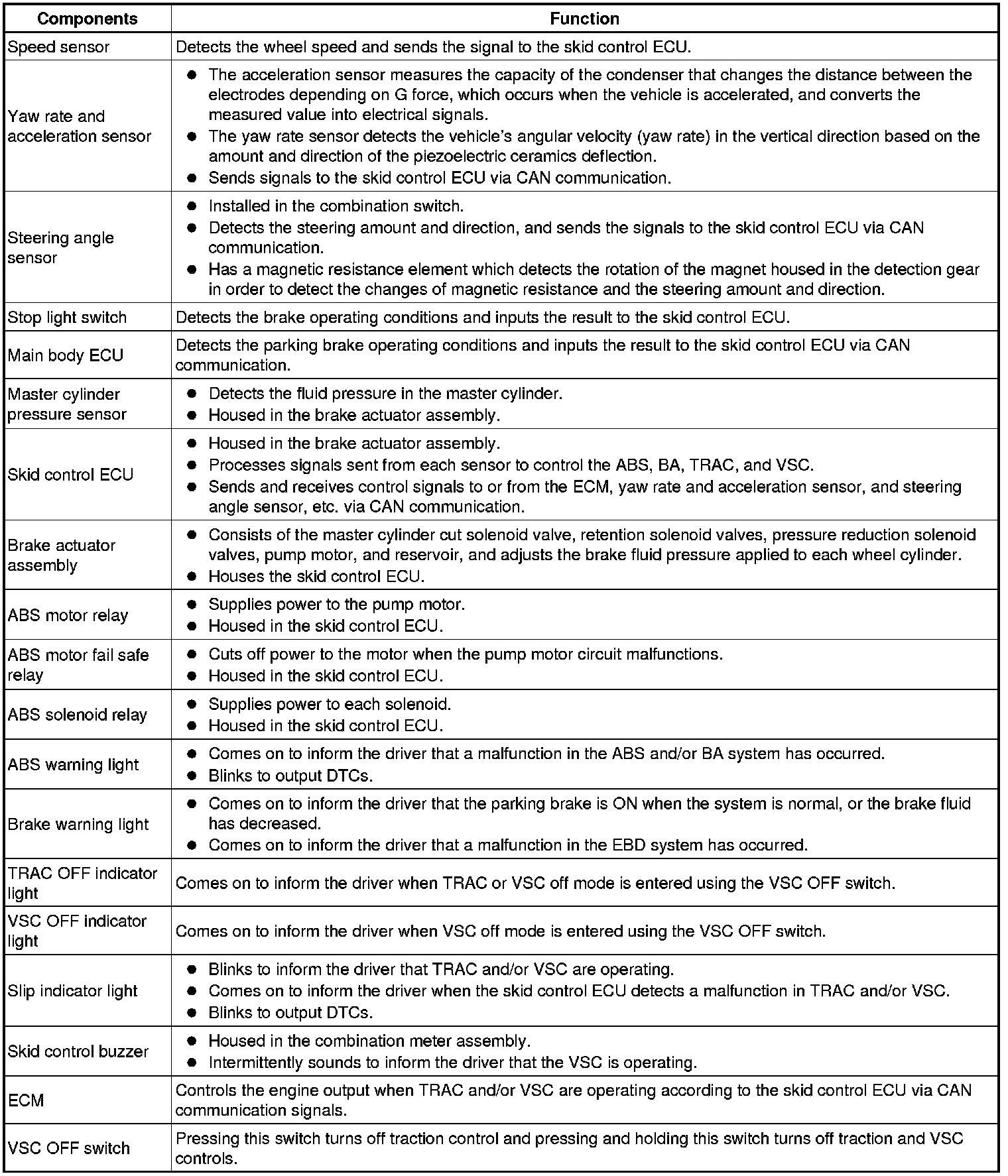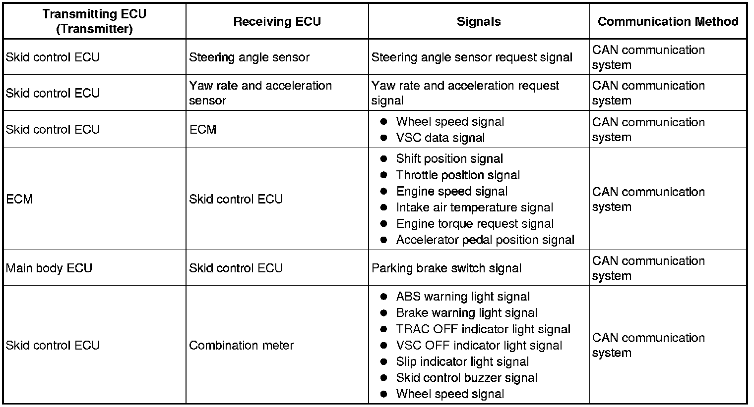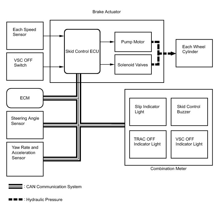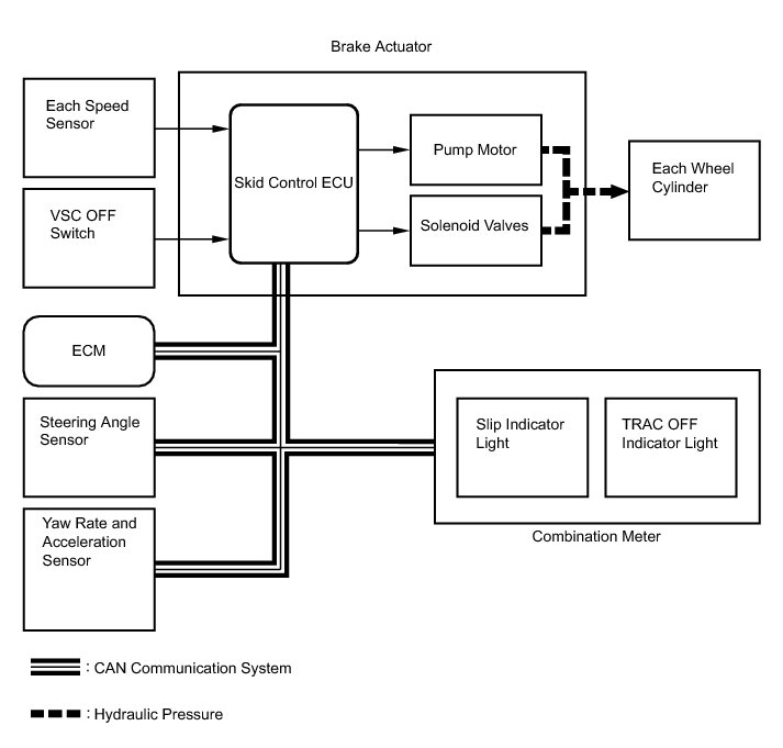 The skid control ECU determines the vehicle operating conditions based on signals received from the wheel speed sensors, yaw rate and acceleration sensor, and steering angle sensor. The skid control ECU sends signals via CAN communication to the ECM in order to control engine torque. The skid control ECU controls brake hydraulic pressure using the pump and solenoid valves.