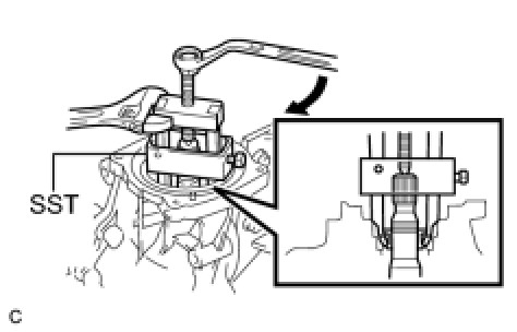 (a) Using SST, remove the rear drive pinion front tapered roller bearing (outer race) from the rear differential carrier.