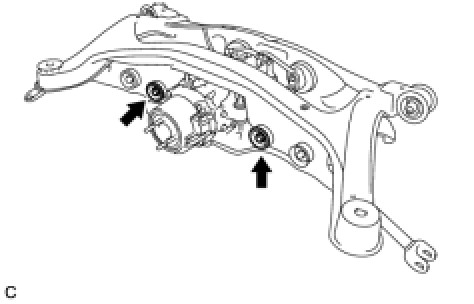 (b) Temporarily install the rear differential carrier assembly with differential support to the front side of the rear suspension member assembly with the 2 bolts and 2 nuts.