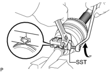(e) Using SST, inspect the clearance of the rear drive shaft outboard joint boot clamp.