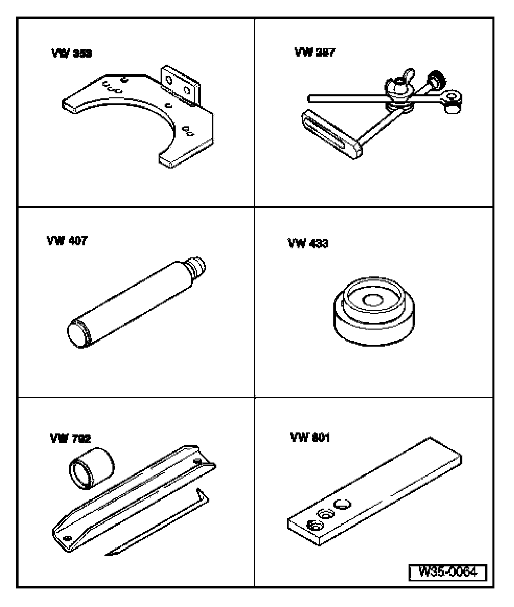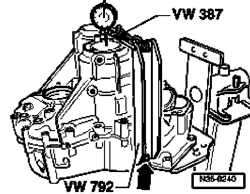 ^ Install measuring tools and secure with bolt (arrow) to transmission housing.
