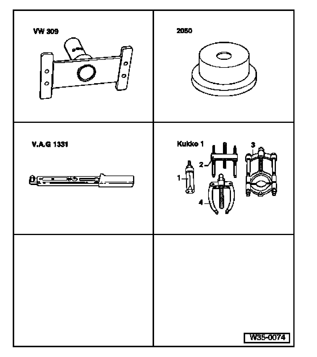 ^ Press tapered roller bearing outer race with a 1.70 mm thick shim into transmission housing, supporting transmission housing directly under bearing support with thrust piece 2050.