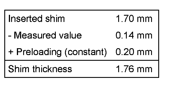 The specified bearing pretension will be attained by subtracting the measured value (0.14 mm) from the inserted shim (1.70 mm) and adding a constant for pressing (0.20 mm).