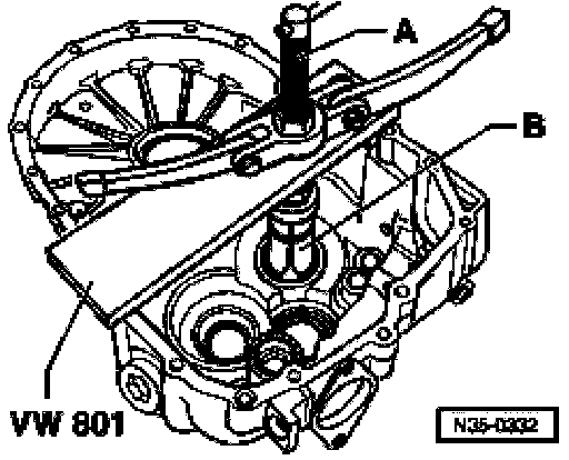 ^ Install transmission housing and tighten bolts -A- and -B- diagonally to correct torque.