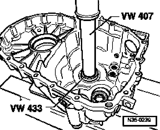 ^ Remove transmission housing and pull tapered roller bearing outer race out of transmission housing.
