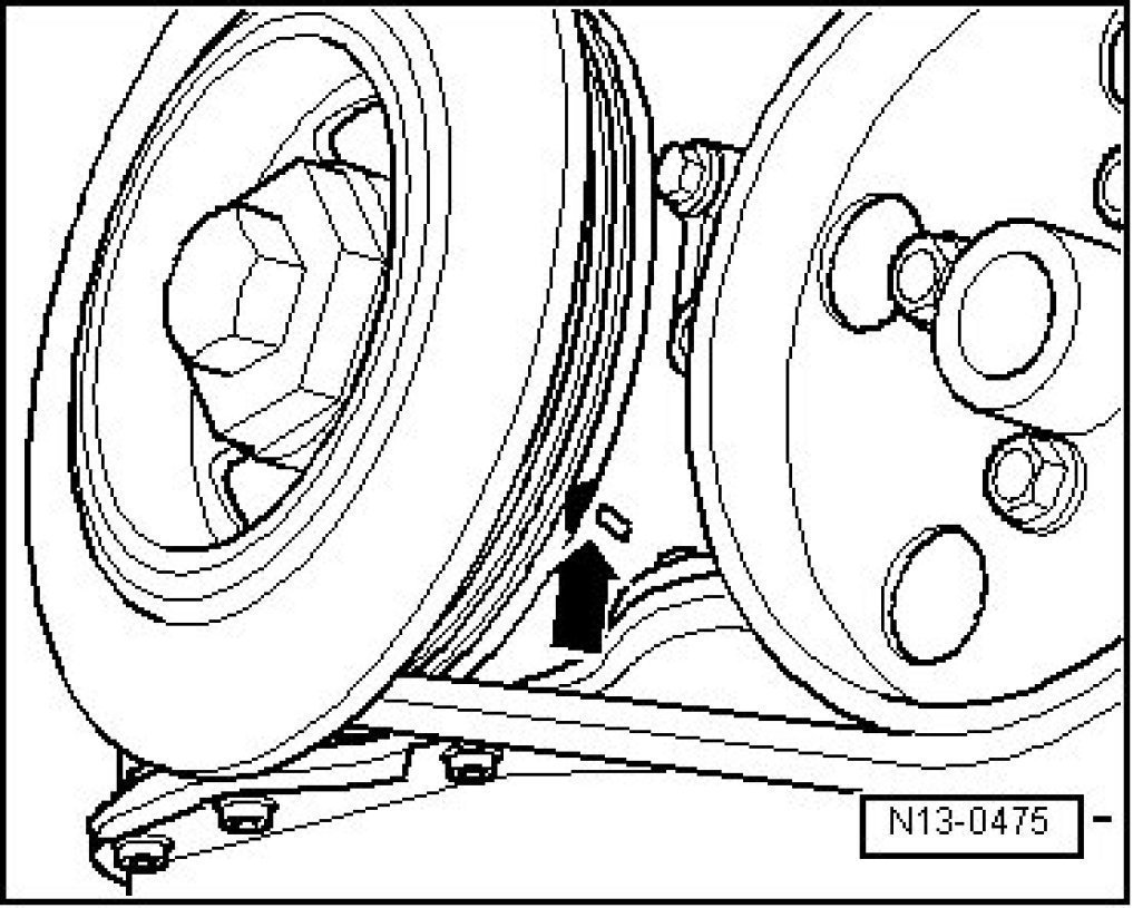 - Rotate the crankshaft using the vibration damper bolt, in engine rotation direction to the Top Dead Center (TDC) cylinder mark -arrow-.