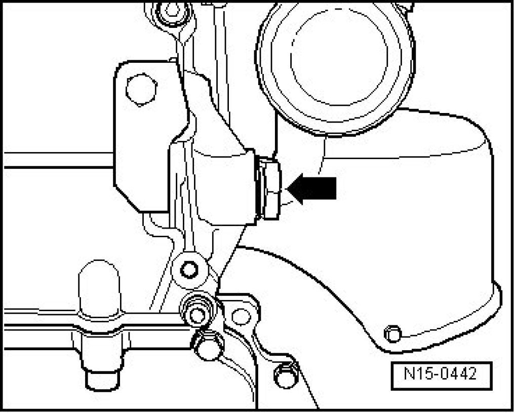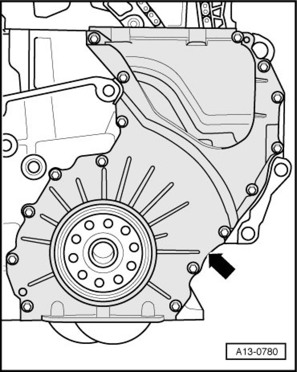 - Remove the bolts and remove the sealing flange -arrow- horizontally from the cylinder block. Take care not to damage the cylinder head gasket in the process.