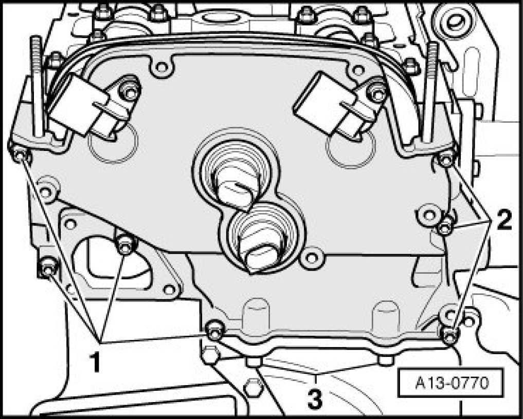 - Remove the bolts -1 through 3- and remove the cover horizon from cylinder head. Take care not to damage the cylinder head gasket in the process.