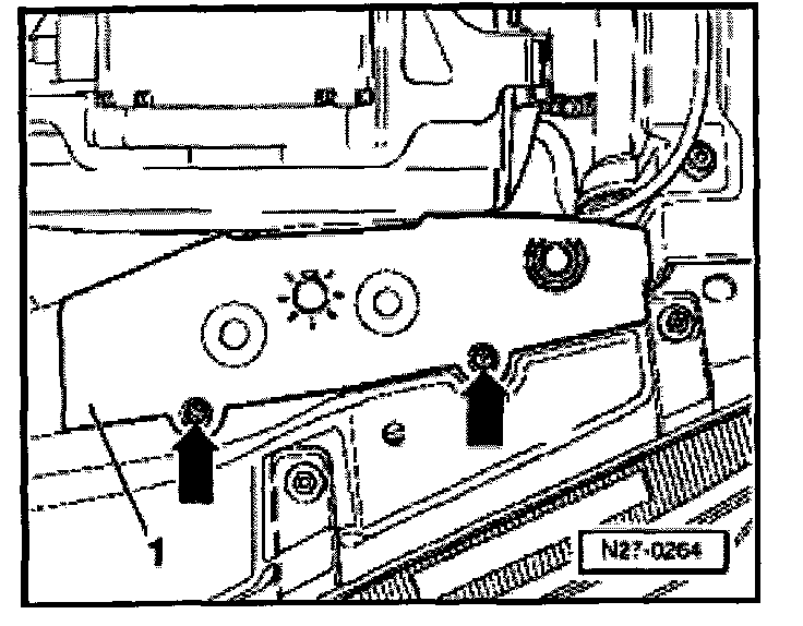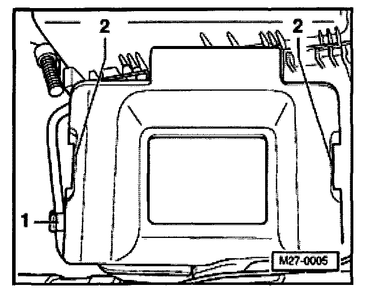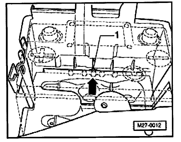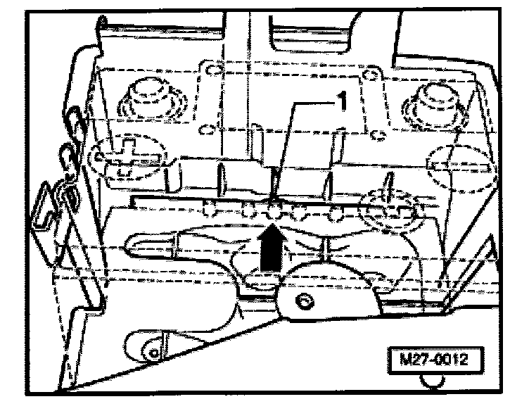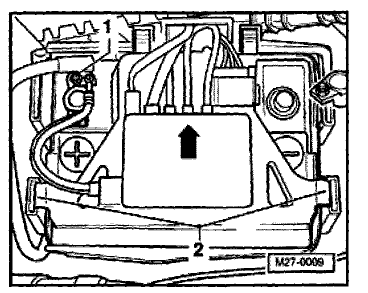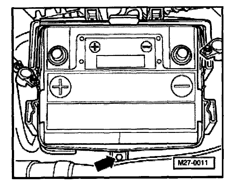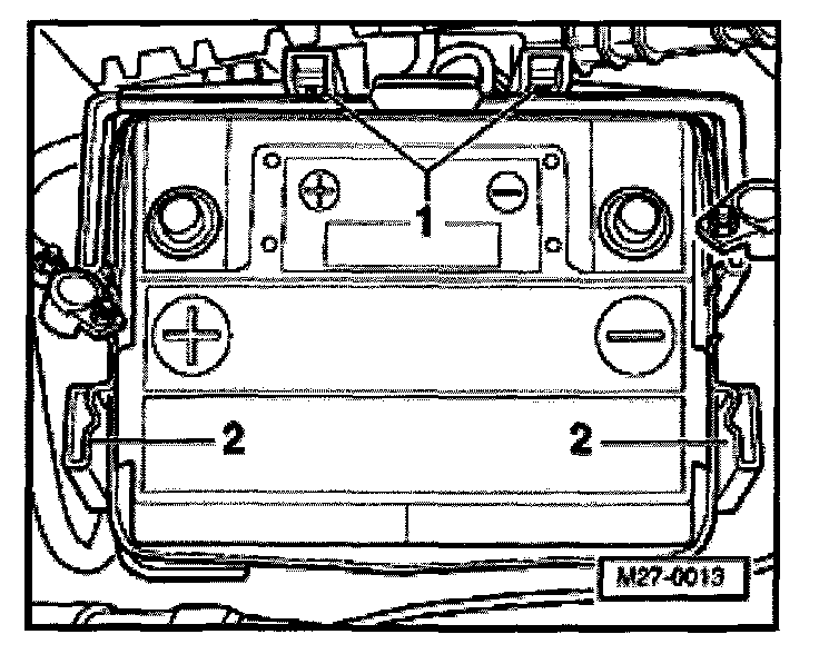 - Install battery so battery carrier lug - arrow- engages in battery foot strip cut-out -1-.