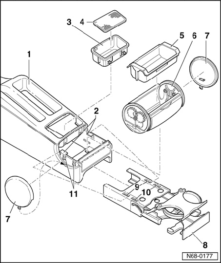 Loosen ashtray - 6 - at right and left from locking lugs - 11 - and remove.