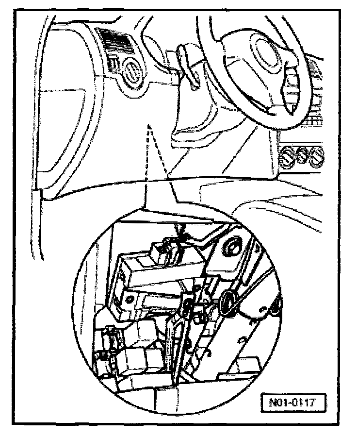 The convenience system control unit -J393- is located under the dash panel and is secured with a bracket to the steering column. It is equipped with a DTC memory. The On Board Diagnostic (OBD) connection is located under the driver's knee bar to left of the steering wheel.