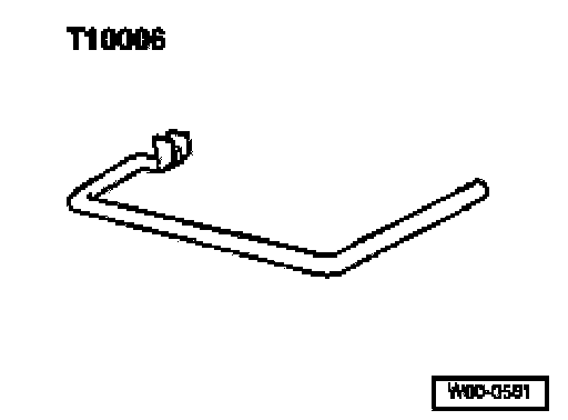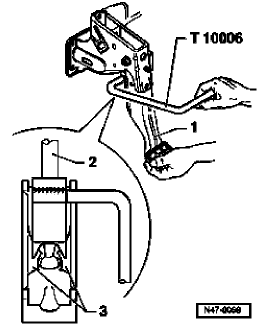 - Insert special tool T 10006 and pull in direction of driver's seat, when doing this counter-hold on brake pedal. (At this moment the pedal must not be allowed to move backward). Thereby the mounting retaining lugs -3- will be pressed off the ball head of the push rod -2-.