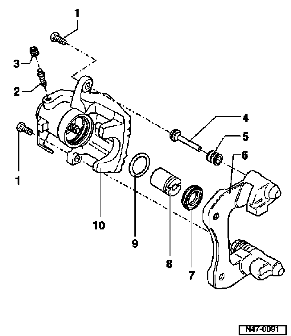 - Apply thin coat of assembly lubricant G 052 150 A2 to brake cylinders, pistons and seals.