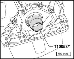 - Press in oil seal using pressure sleeve T10053 and bolt T10053/2 (M16 x 1.5 x 60) up to stop.