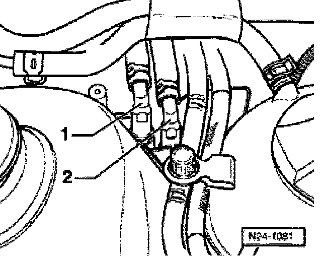 - Pull off supply line/hose -1- (with white marking) and return line/hose -2- (with blue marking) and collect fuel that leaks out with a cloth.