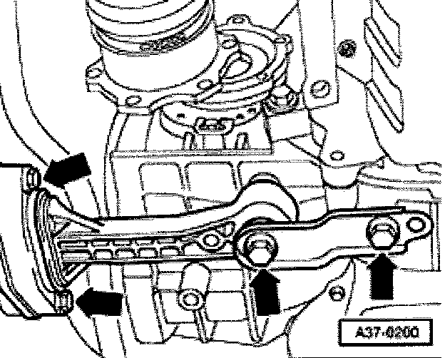 - Remove subframe mount from transmission bracket -arrows- on transmission side from above