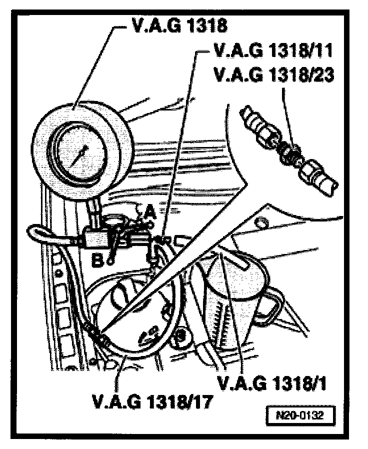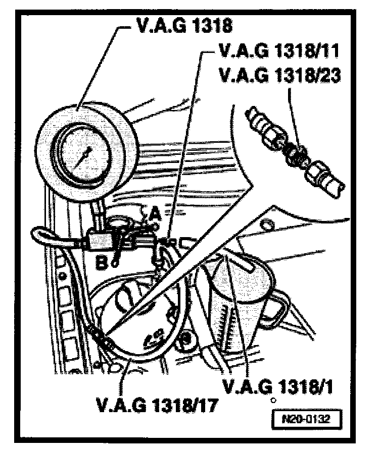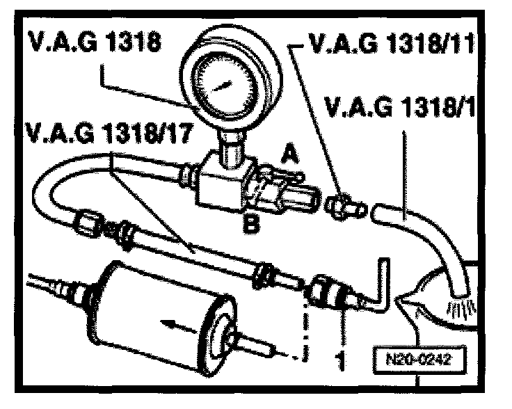 - Connect pressure gauge V.A.G 1318 with adapter 1318/23 and V.A.G 1318/17 to the fuel supply pipe.