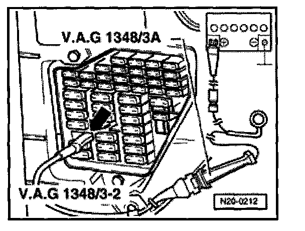 - Connect VAG 1348/3A remote control to Fuel Pump (FP) and B+ at terminal 28a using VAG 1348/3-2 remote control connection.