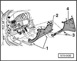 NOTE: Left trim - 2 - must be removed first because one of bolts - 3 - is located under trim - 2 -.